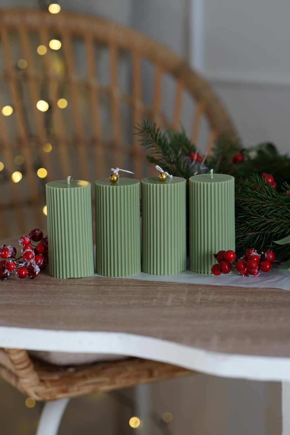 Enjoy the magical Advent and Christmas season with our hand-crafted candles made from pure soy wax. The Amari candle in medium size, in a beautiful light green shade, features a cone shape with delicate ridges around the surface. The set includes 4 soy wax candles, perfect for your Advent wreaths and festive decorations.