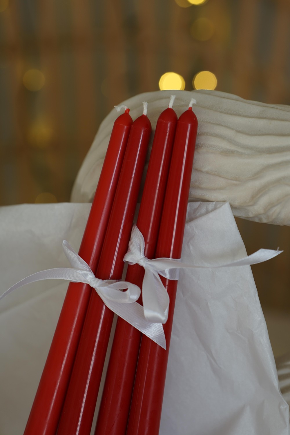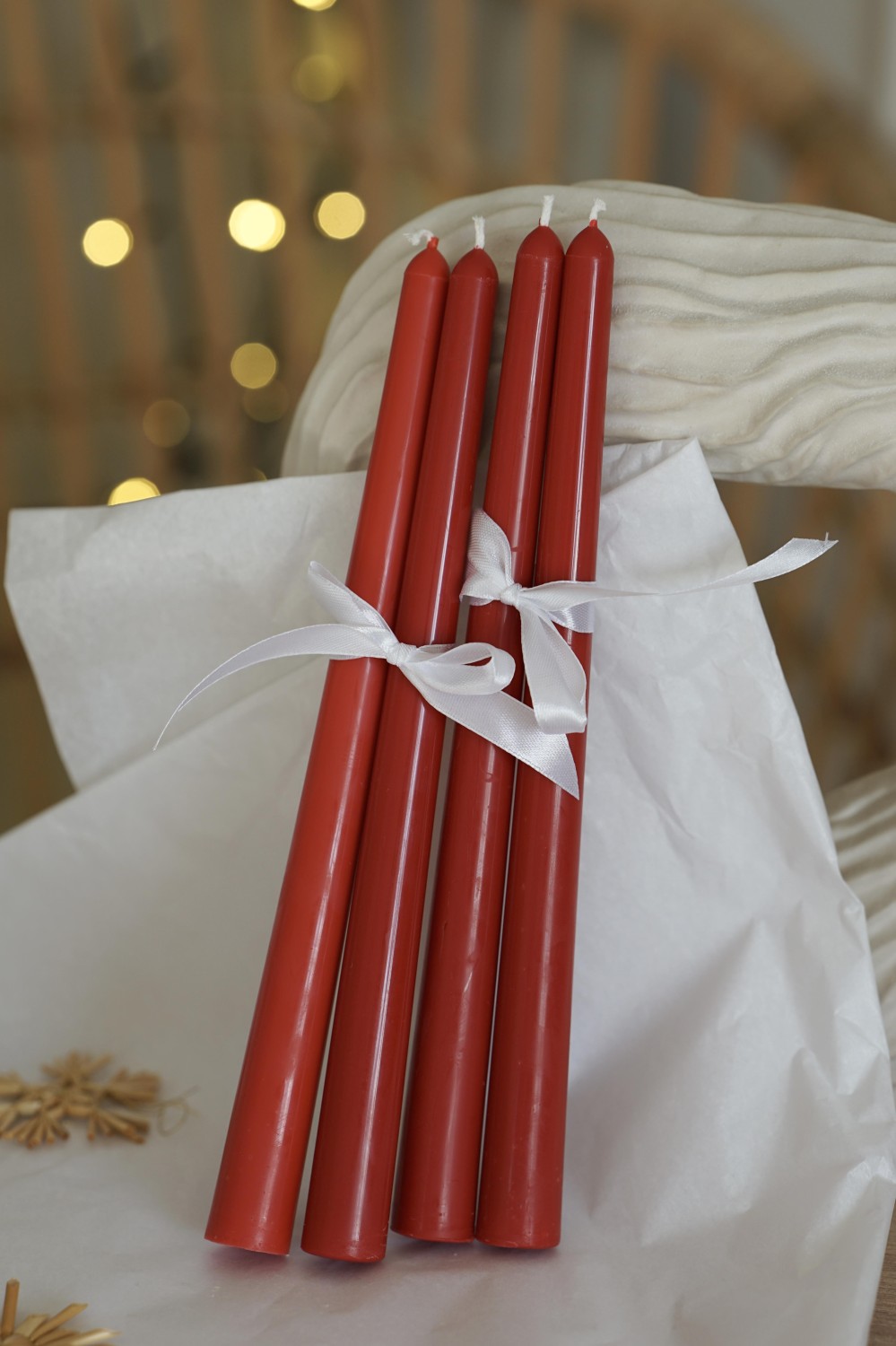Enjoy the magic of the Advent season with our handcrafted candles. These candles are made from a blend of beeswax and soy wax in a beautiful red shade. Eleni is tall and gently tapered, finishing with a rounded top. The set includes 4 candles made from a mixture of beeswax and soy wax for your Advent wreaths and festive decorations.