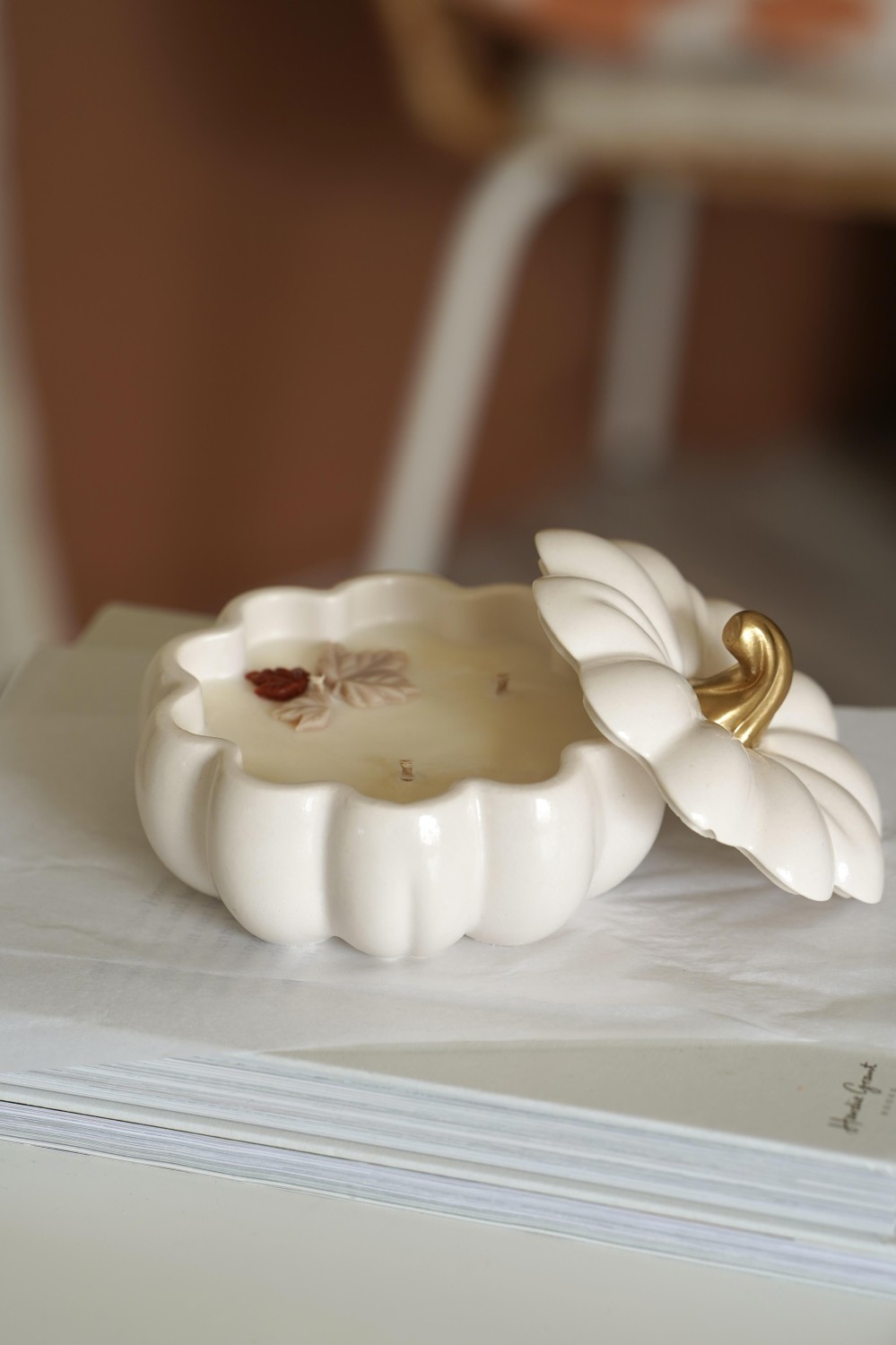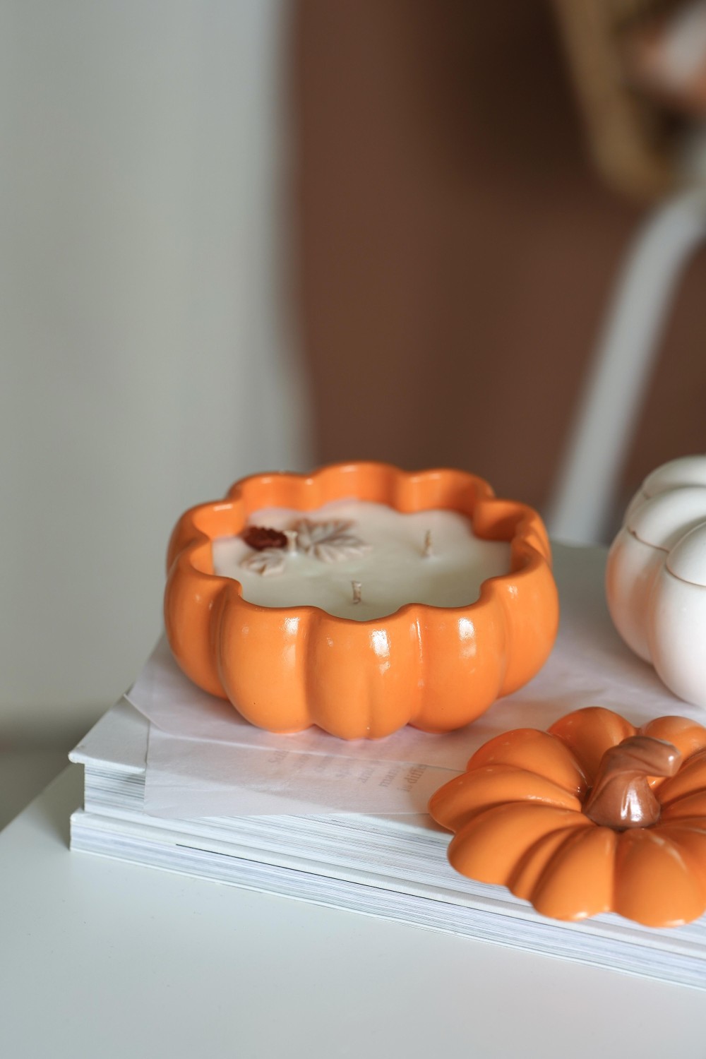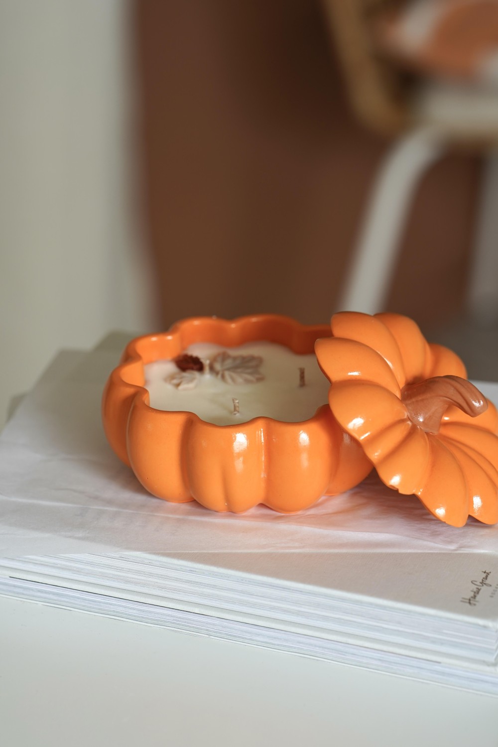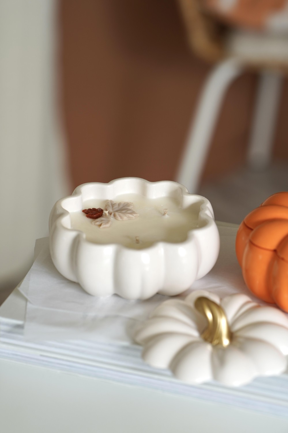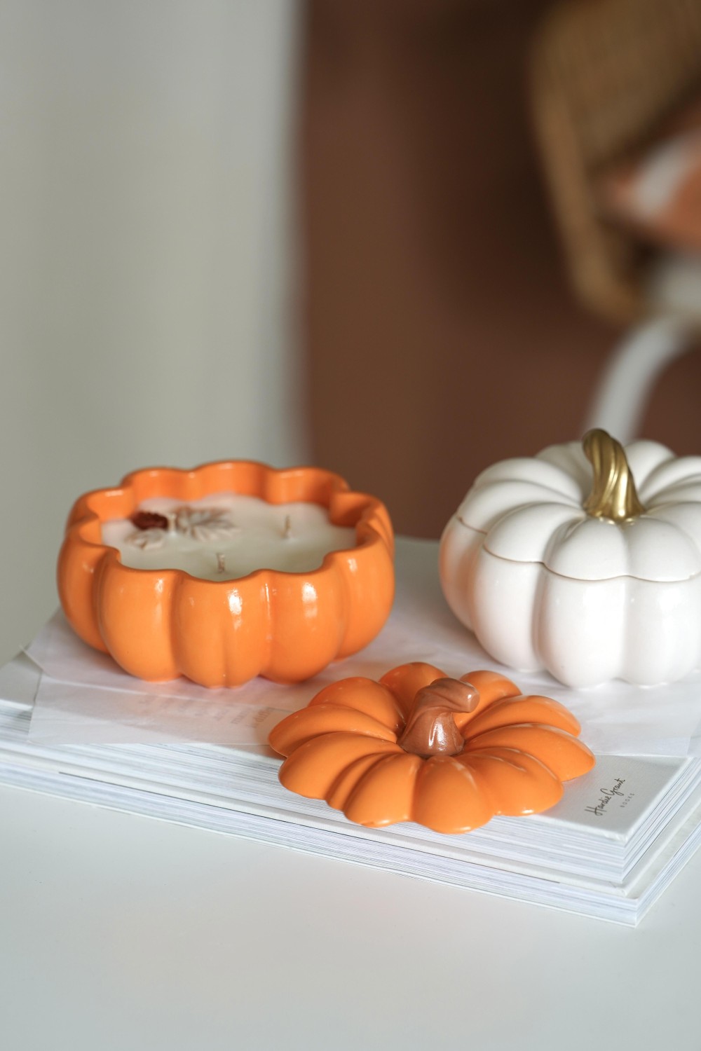 Each candle sits in a handmade Jesmonite vessel in either a warm orange or natural white tone, shaped like a small pumpkin. Inside are three cotton wicks for an even burn.