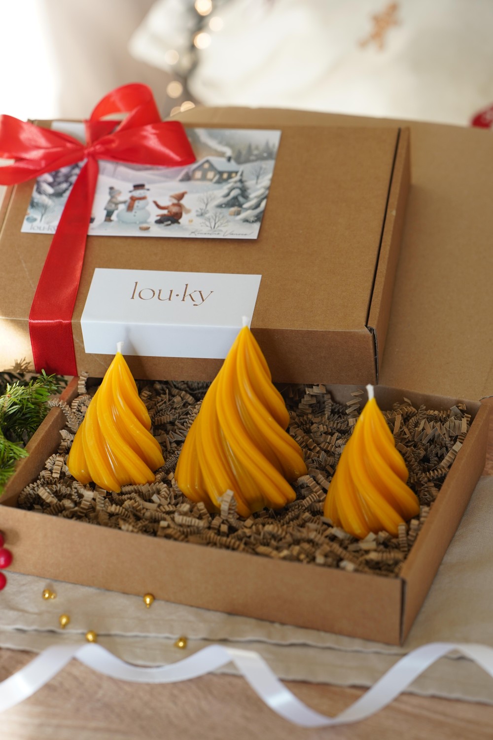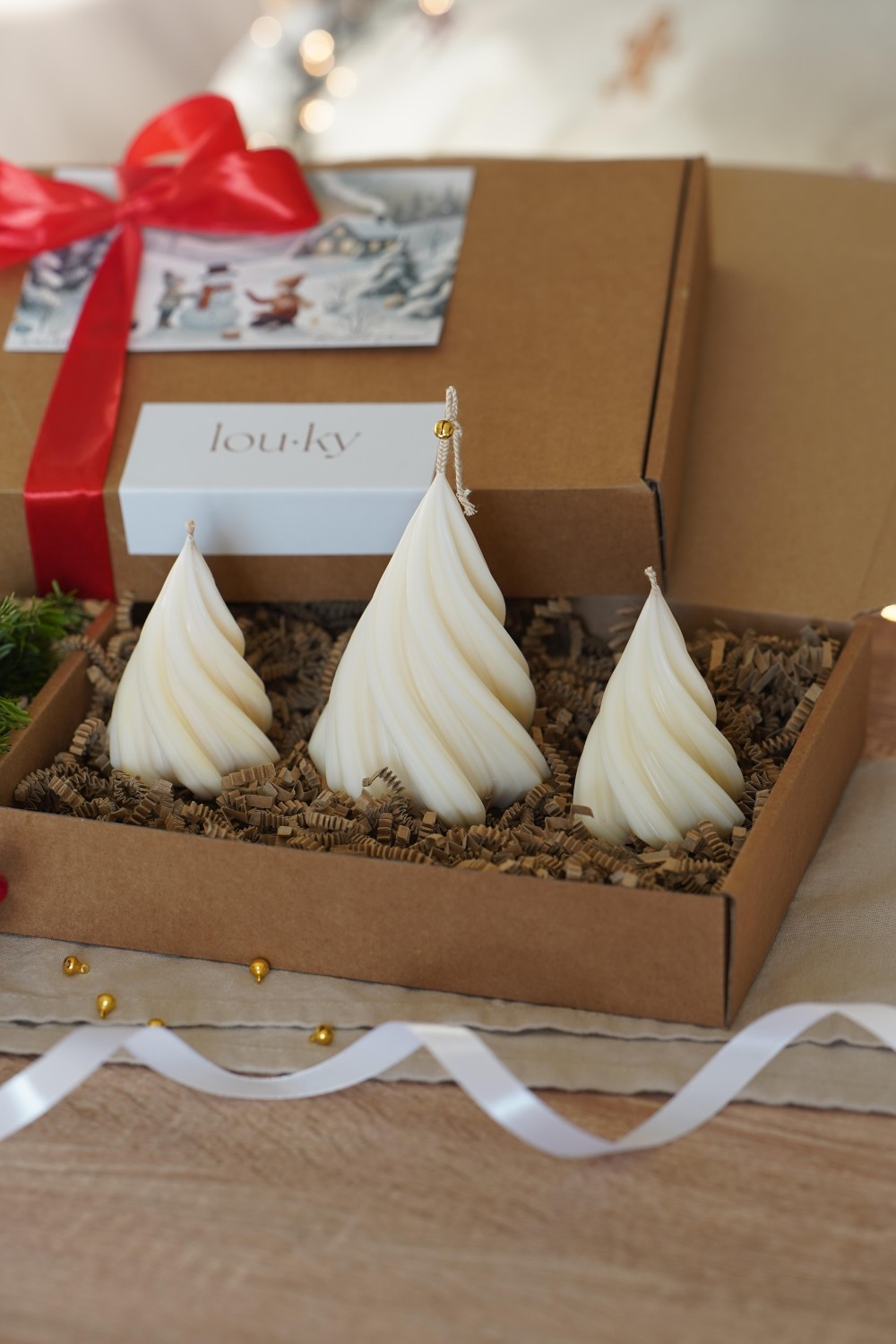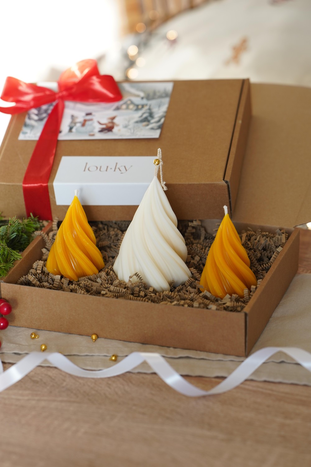 This charming candle set includes one large and two small twisted tree candles — a perfect way to bring the spirit of Christmas into your home. The set makes an elegant centerpiece for your festive table or a thoughtful handmade gift for your loved ones. Each candle is hand-poured and packed in a paper gift box tied with a ribbon (see photos). You can choose between pure soy wax or natural beeswax.