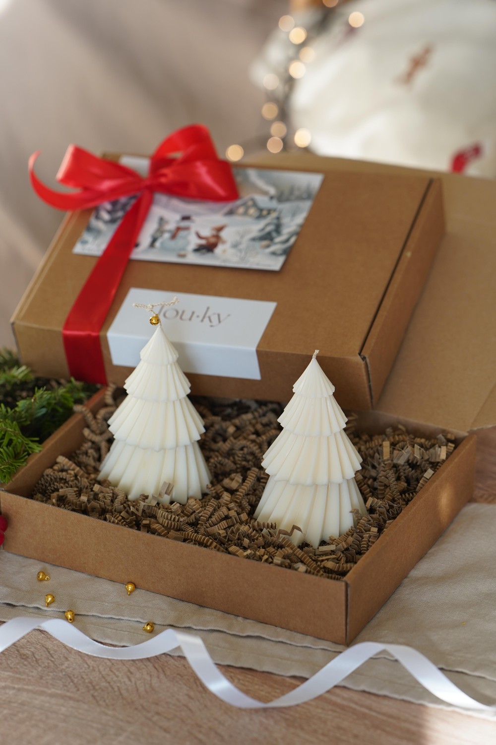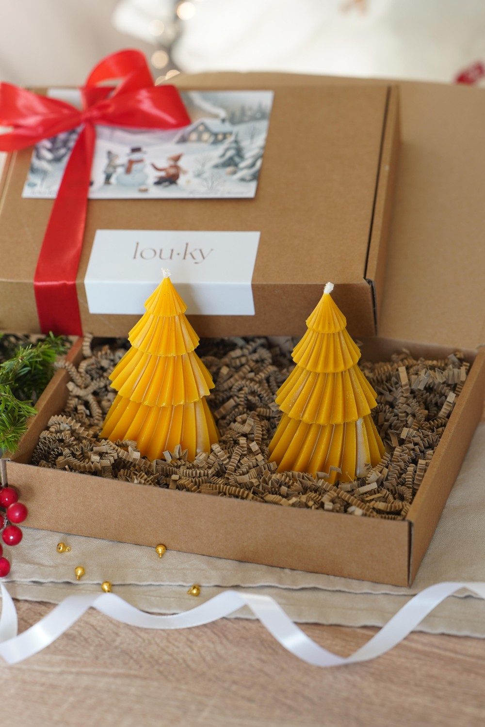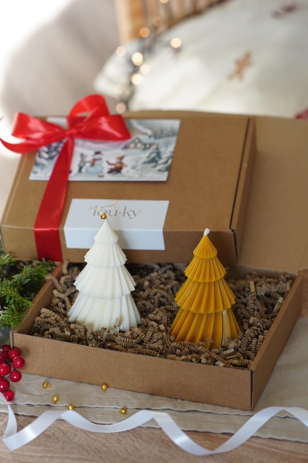 This candle set includes two large “dancing” tree candles — the perfect way to fill your home with Christmas spirit. The set makes a beautiful addition to your festive table or a thoughtful handmade gift for your loved ones. Each candle is carefully hand-poured and presented in a paper gift box tied with a ribbon (see photos). You can choose between pure soy wax or natural beeswax.