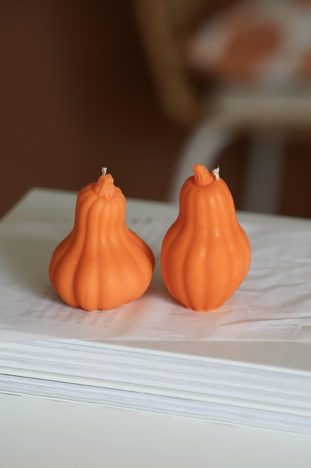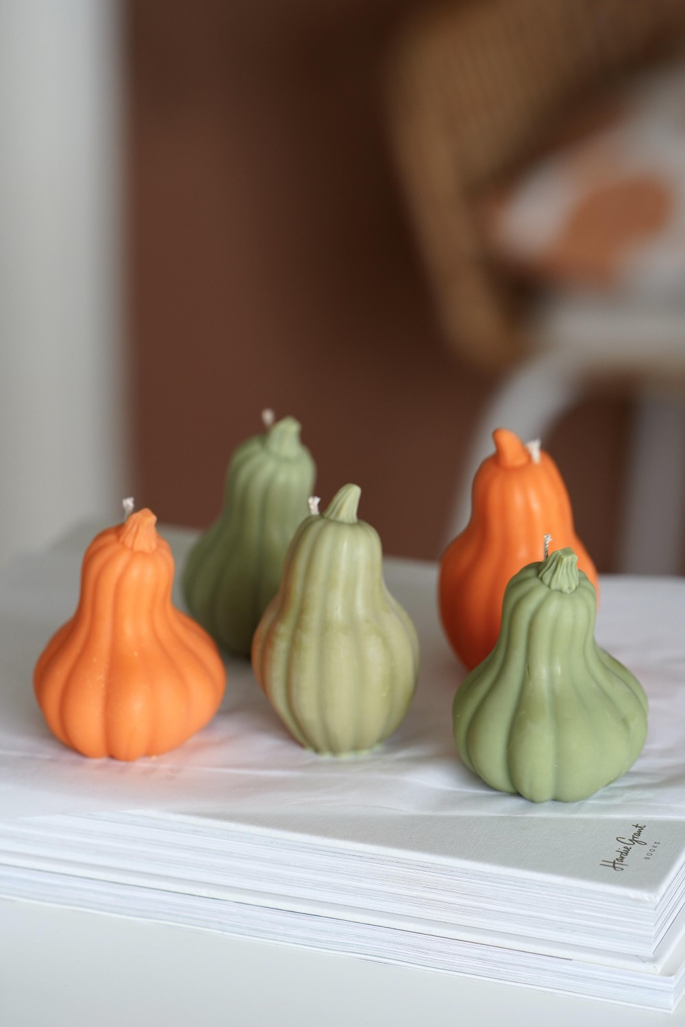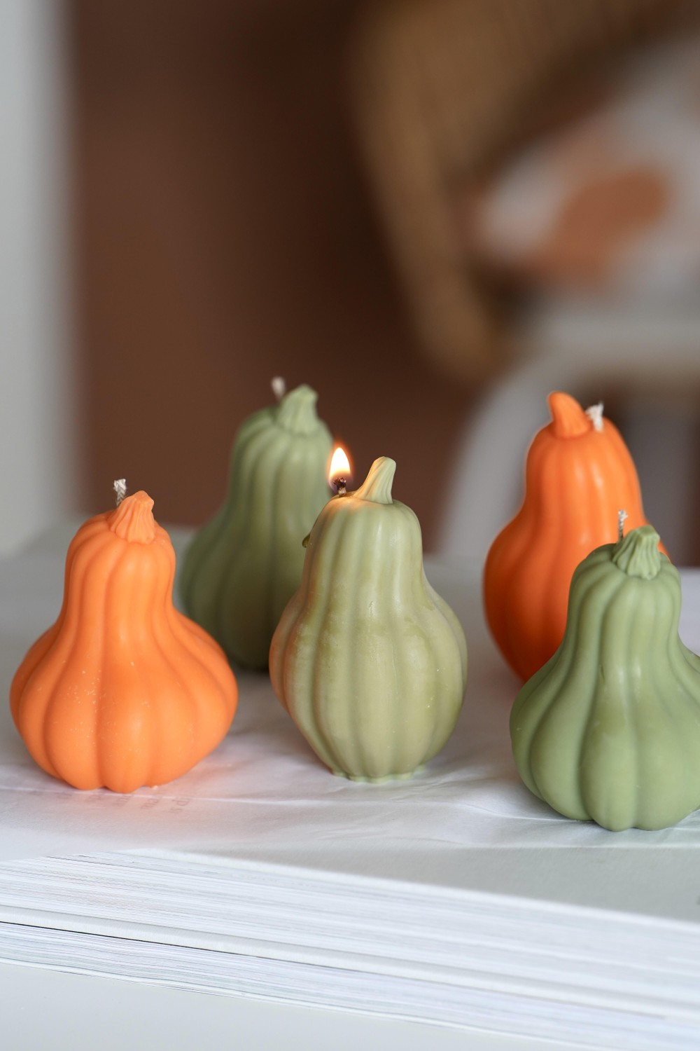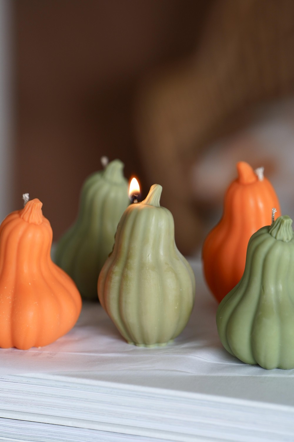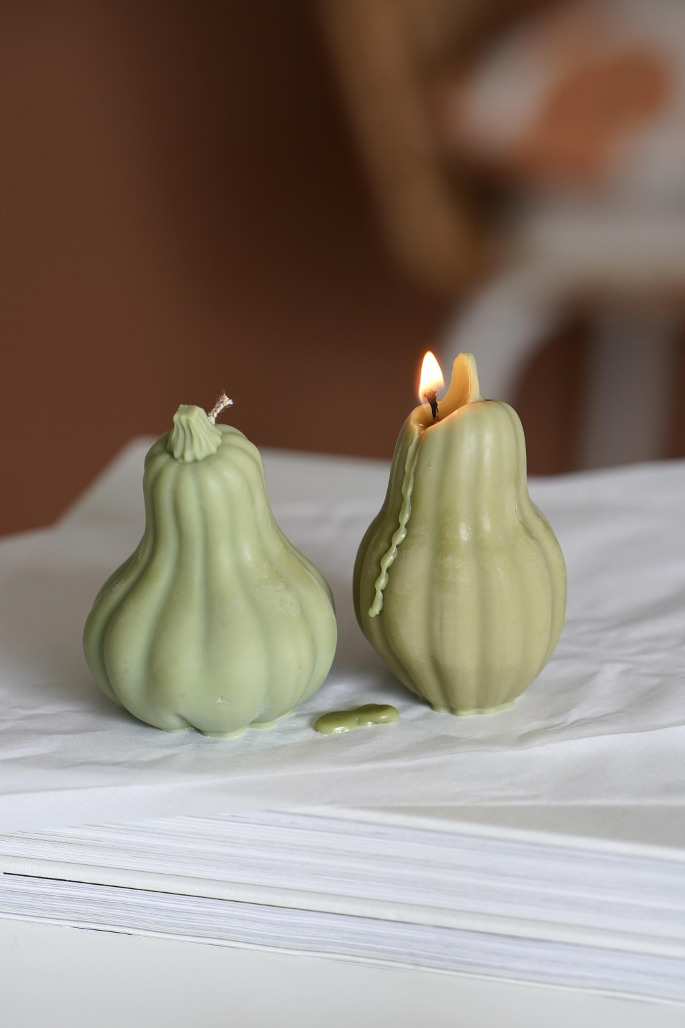 A set of two hand-poured soy candles shaped like ornamental pumpkins because one pumpkin is never enough. Each candle is carefully crafted by hand, capturing the warm spirit of autumn. Choose from a classic orange tone for cozy fall vibes or a soft green hue for a more modern, natural touch.