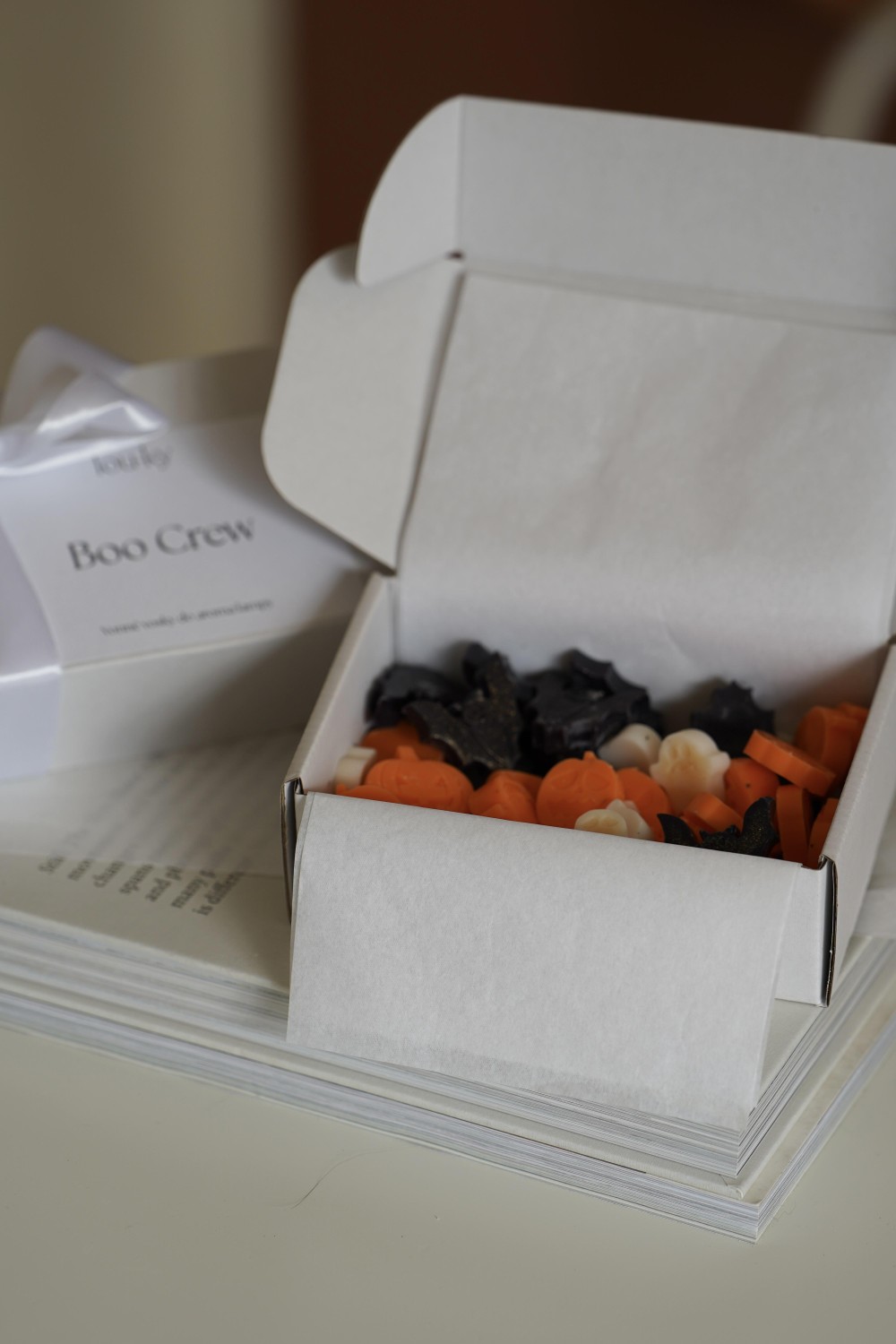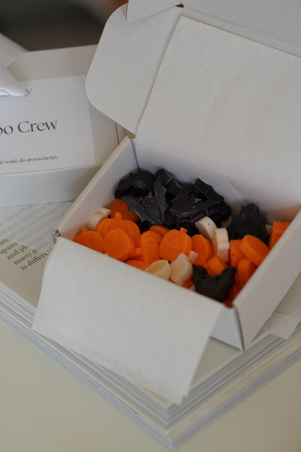 Get ready for a delightfully spooky atmosphere with our Boo Crew wax melts. These charming little melts in the shapes of ghosts, pumpkins, bats, and gravestones are perfect for the Halloween season. Fun to look at and irresistible to smell, they’re made from soy wax and infused with the scent of spiced pumpkin — a warm blend of cinnamon, nutmeg, and sweet pumpkin. When melted, tiny golden sparkles appear in the wax, adding a magical touch. Simply place a few pieces into your aroma lamp and let your home fill with cozy autumn vibes and a hint of mystery. The melts come packed in a decorative box as shown in the photos.