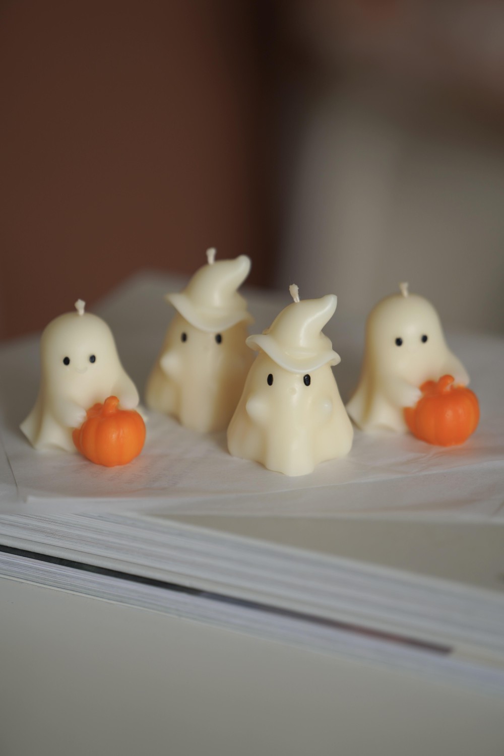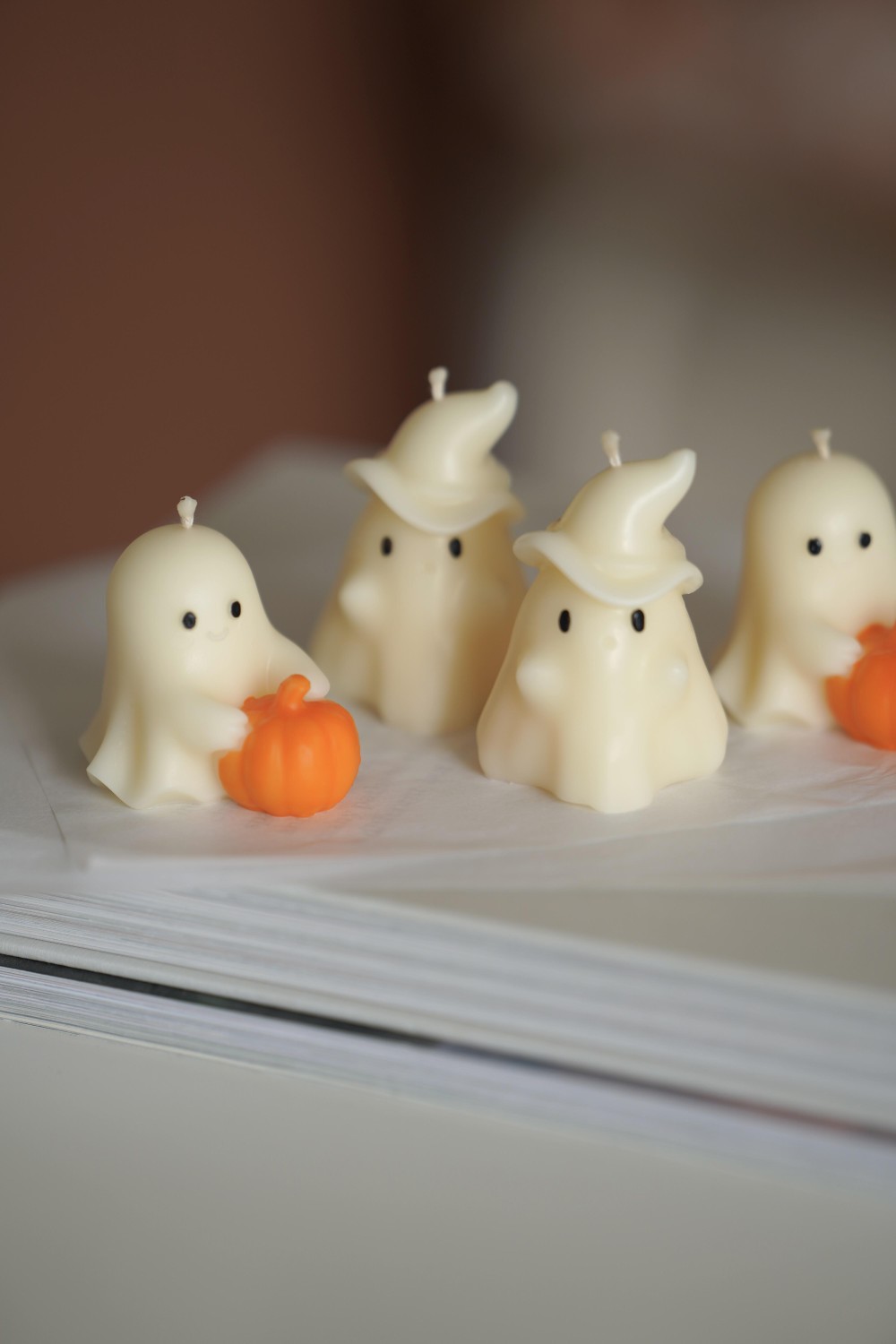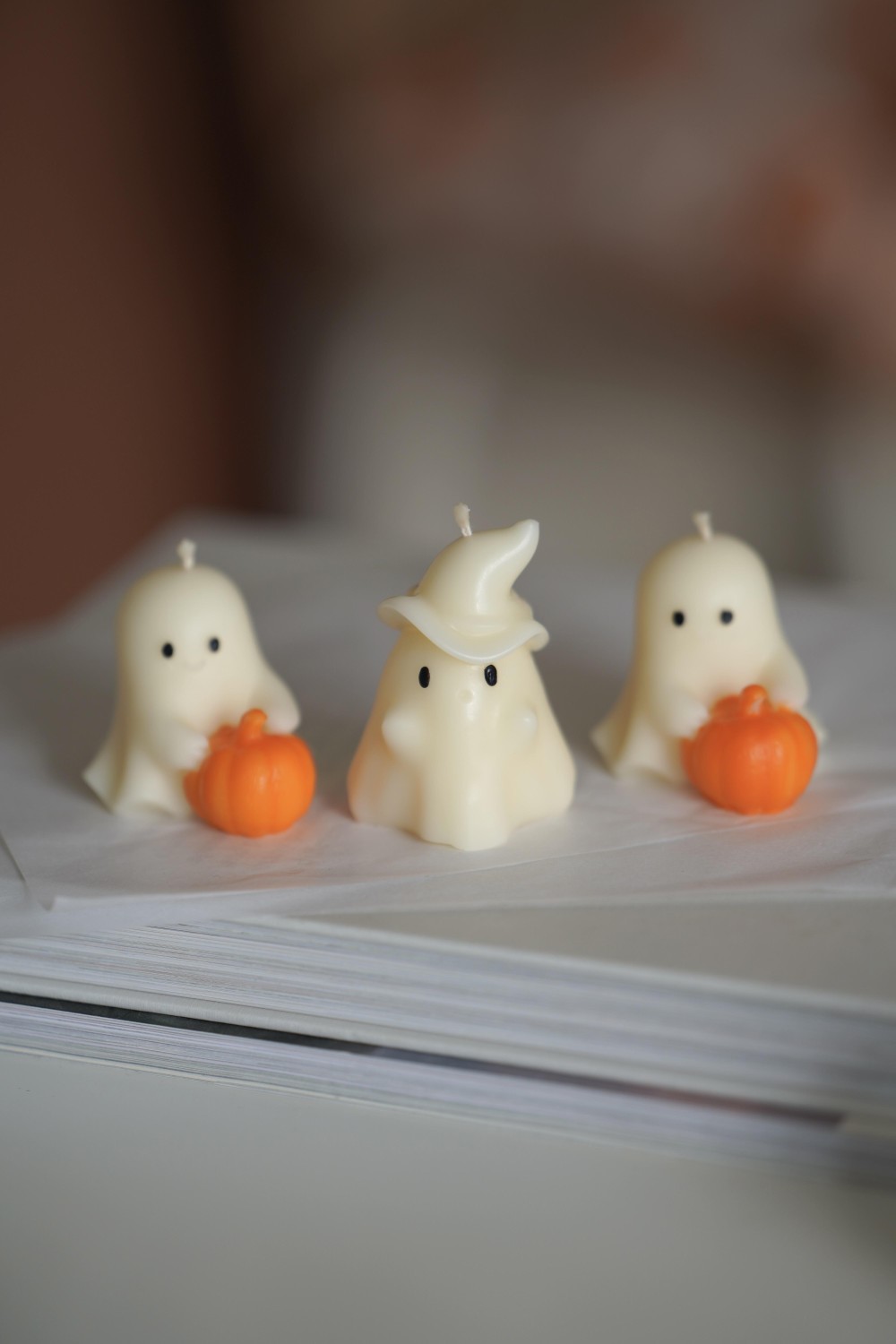 Meet our charming little ghosts – adorable handmade candles perfect for the autumn season. Each candle is hand-poured from a blend of white beeswax and soy wax. You can choose between a ghost with a hat or a ghost holding a pumpkin. These cute spirits will bring a touch of cozy Halloween magic to your home decor.