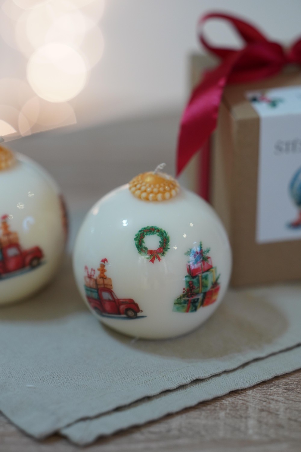 Hand-poured from natural soy wax, the candle is decorated with delicate Christmas motifs such as gingerbread cookies, Christmas trees, little cars carrying animals, and gifts. Each illustration tells a story of childhood joy, returning home, and peaceful moments spent with family. Every detail recalls the magic of old-fashioned Christmases, when happiness was found in the simplest things.