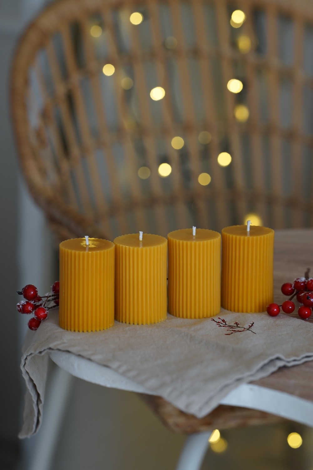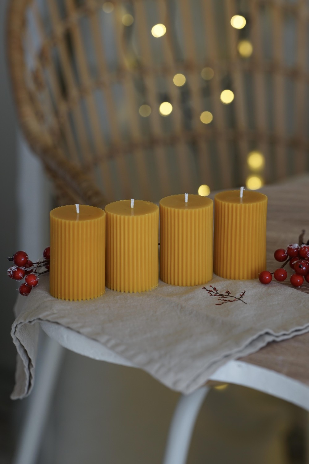 Embrace the magic of Advent with our hand-poured pure beeswax candles that fill your home with a gentle honey scent. The Amari candle has a conical shape with delicate ridges running around its body. The set includes 4 beeswax candles, perfect for Advent wreaths or festive arrangements.