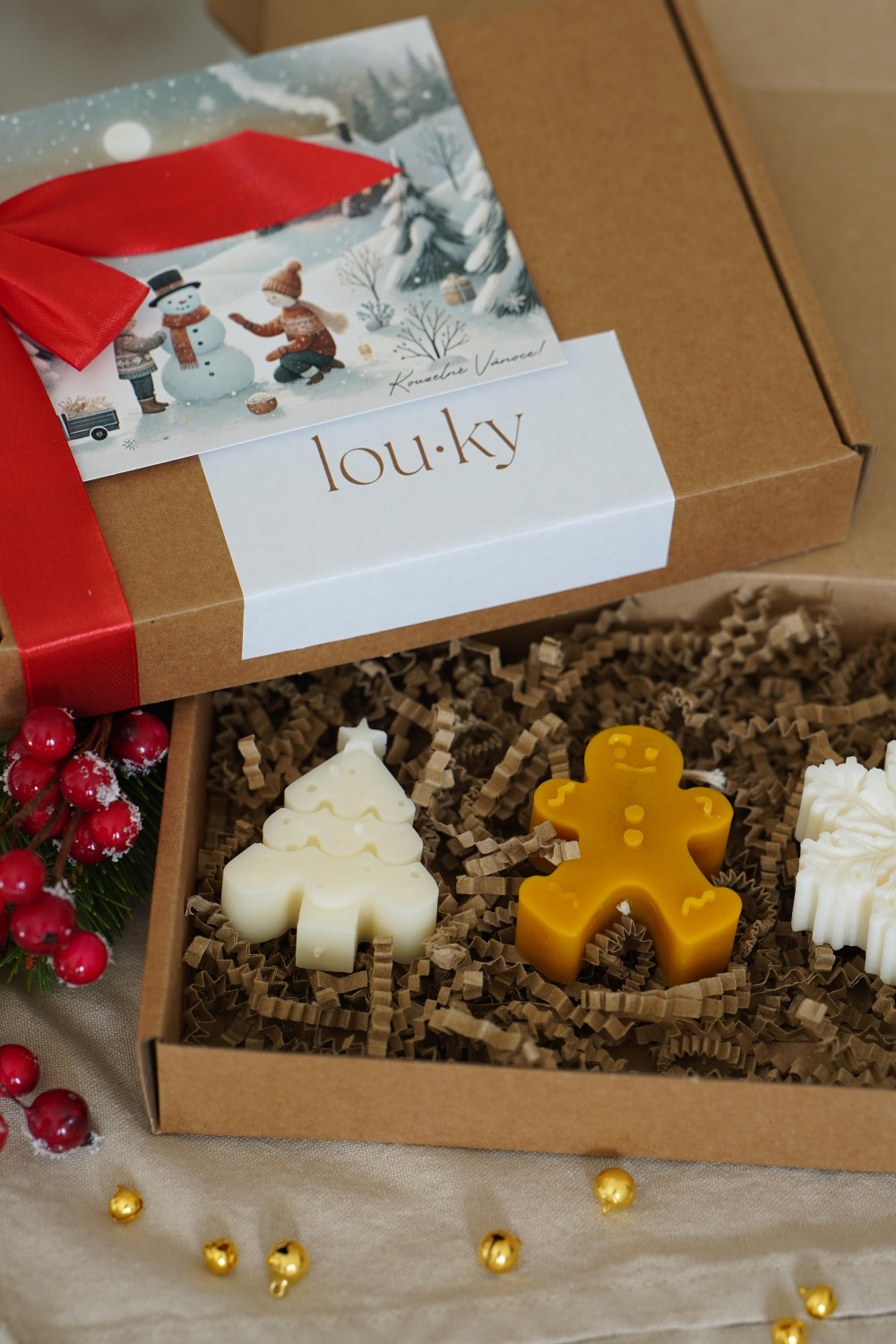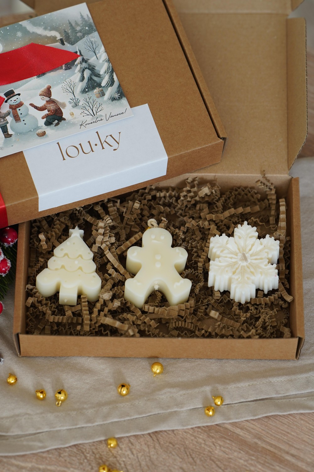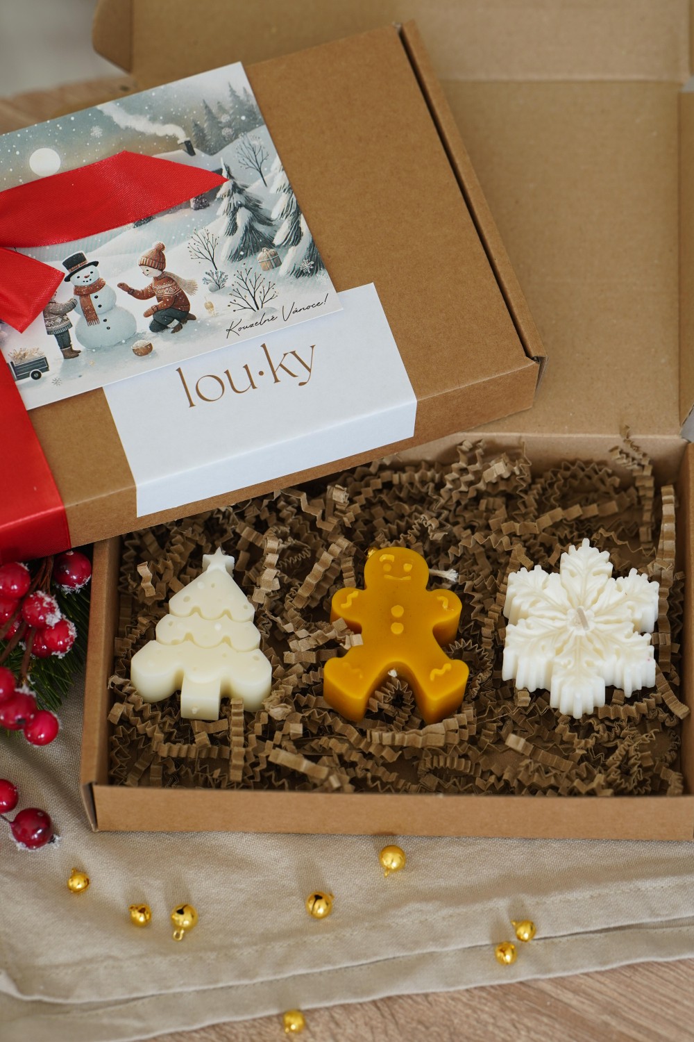 This festive set includes a small Christmas tree, a gingerbread man, and a snowflake candle — a charming trio that brings warmth and coziness to your holiday season. Each candle is hand-poured from a natural blend of soy and white beeswax or pure yellow beeswax. The set comes beautifully packed in a paper gift box tied with a ribbon (see photos).