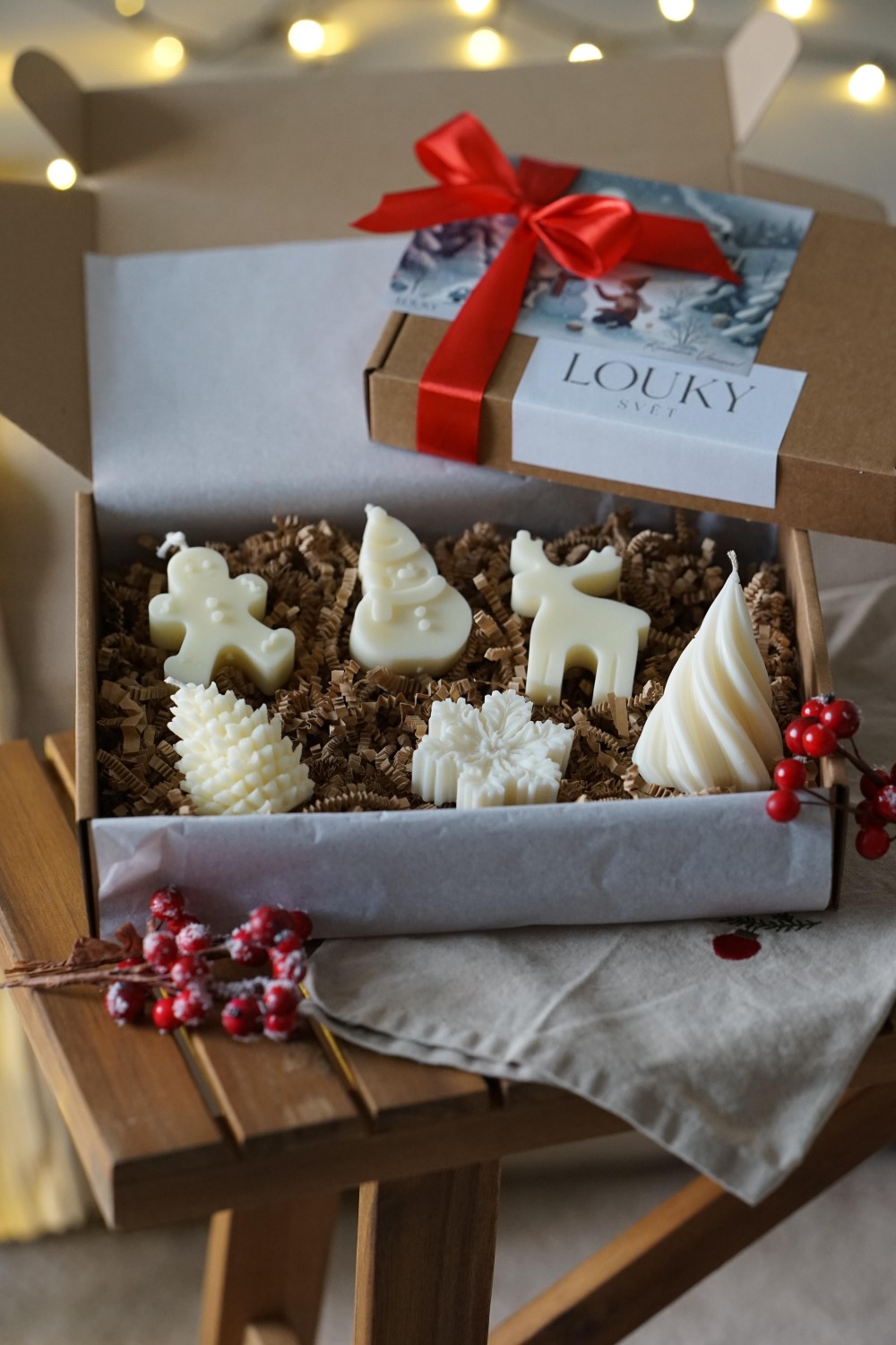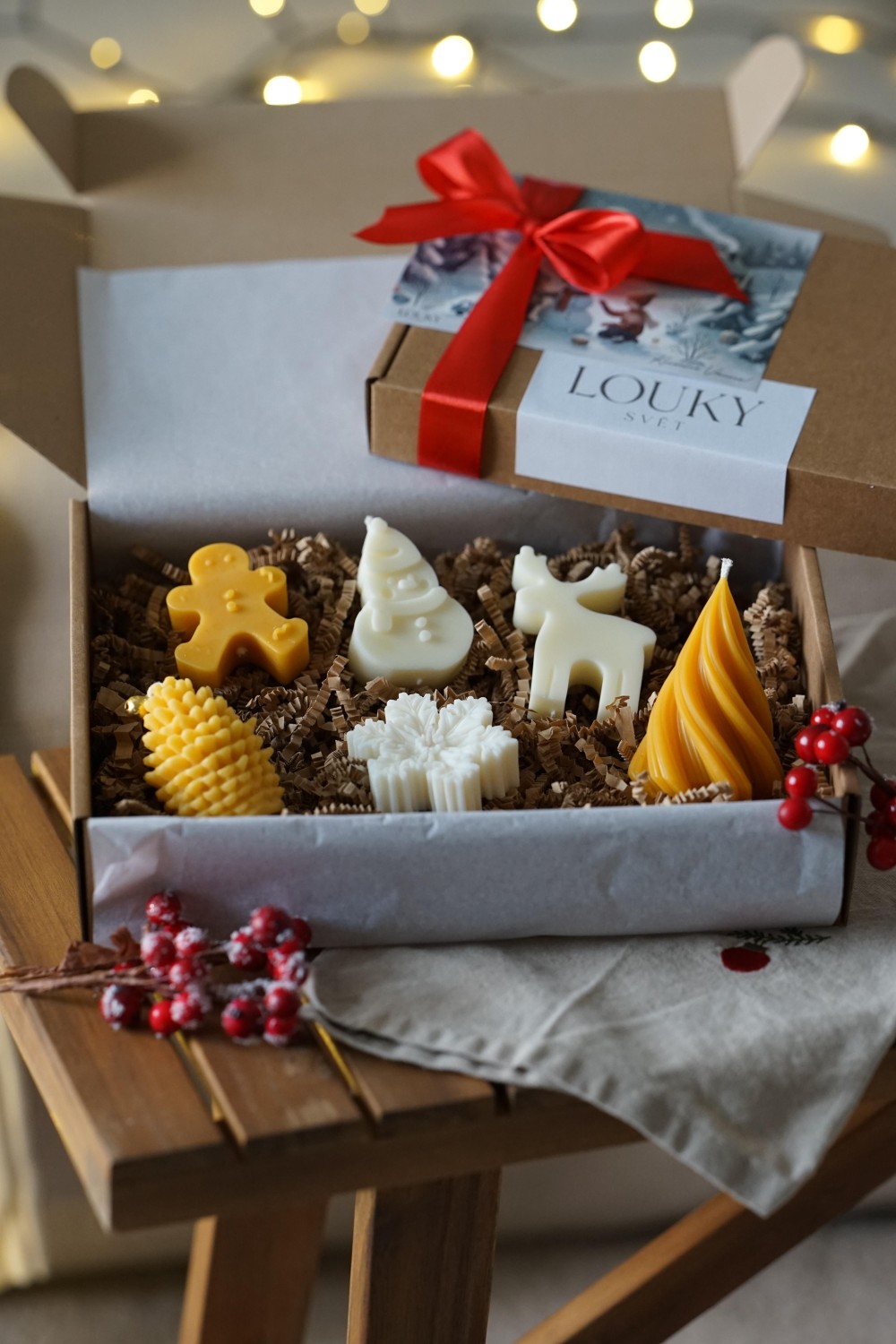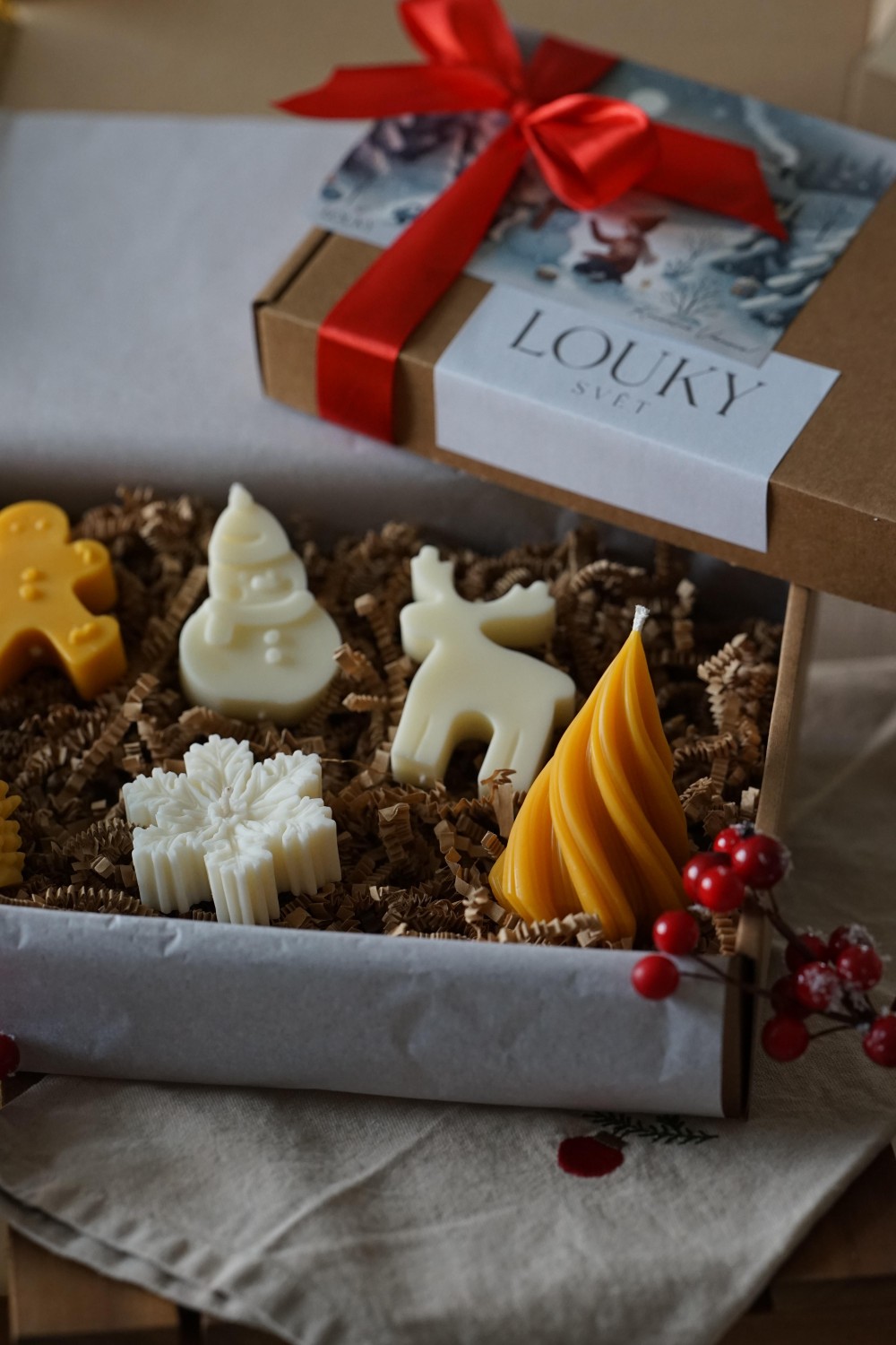 Our Large Christmas Set includes six hand-poured candles — a pine cone, a small twisted tree, a snowflake, a snowman, a reindeer, and a gingerbread man. This charming collection brings festive warmth and style to your home, dining table, or makes a thoughtful gift for your loved ones. Each candle is handcrafted from a blend of soy and white beeswax or pure natural beeswax and comes in a paper gift box tied with a ribbon.
