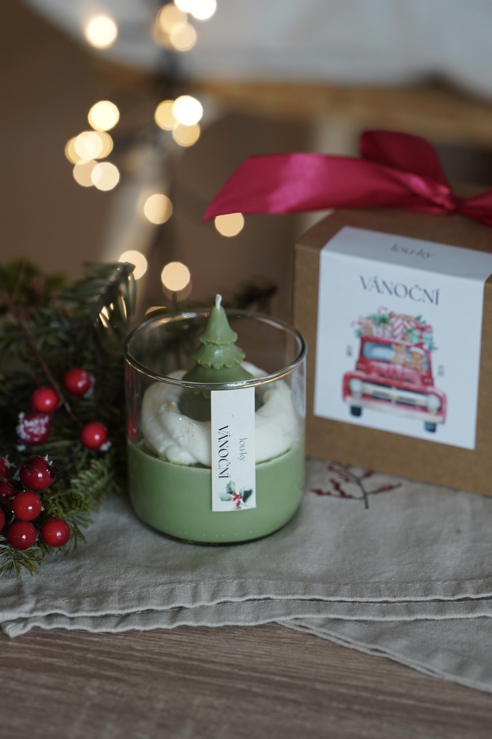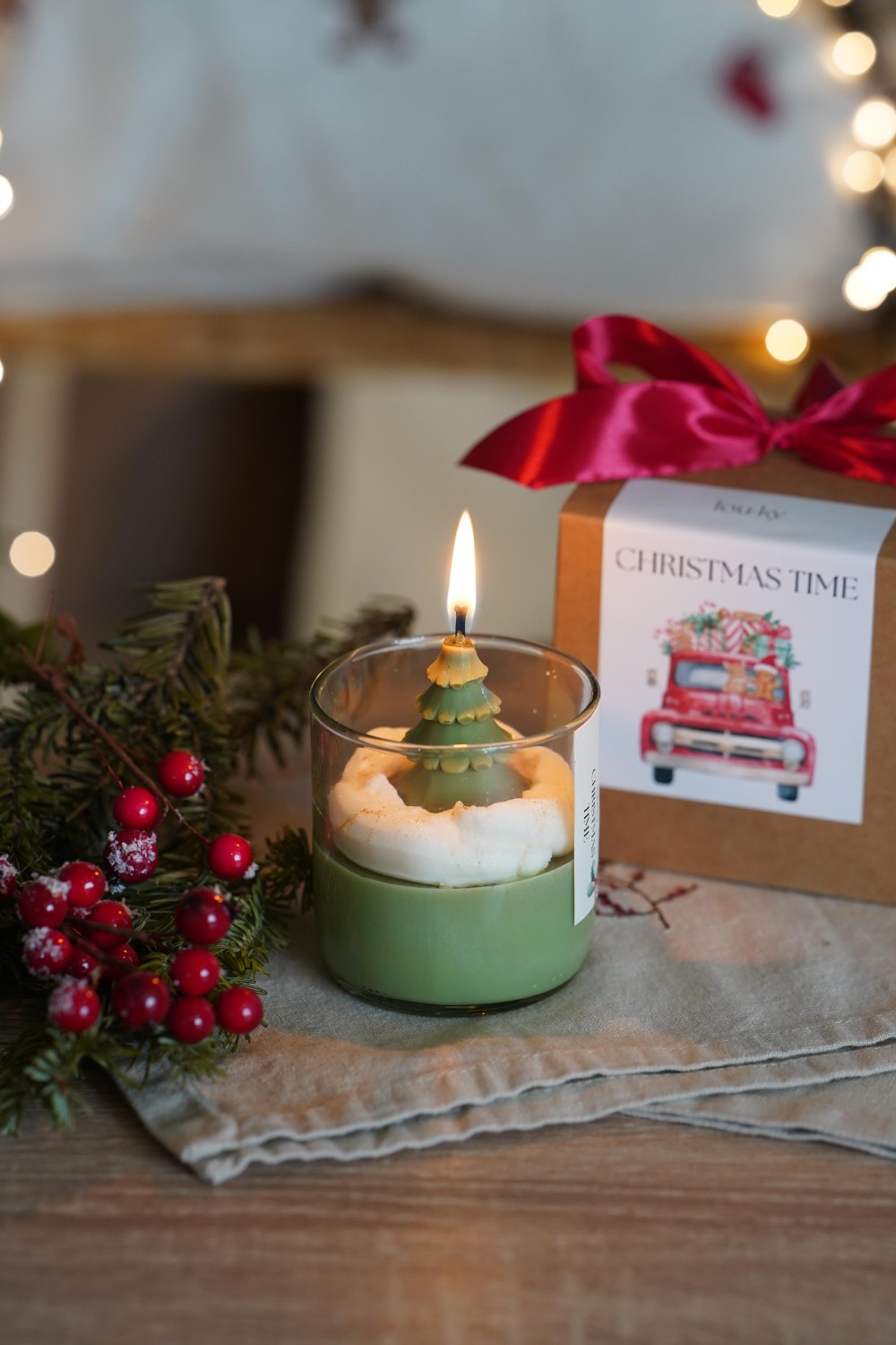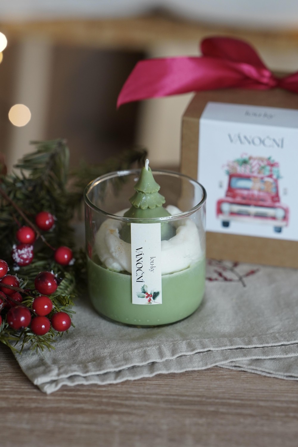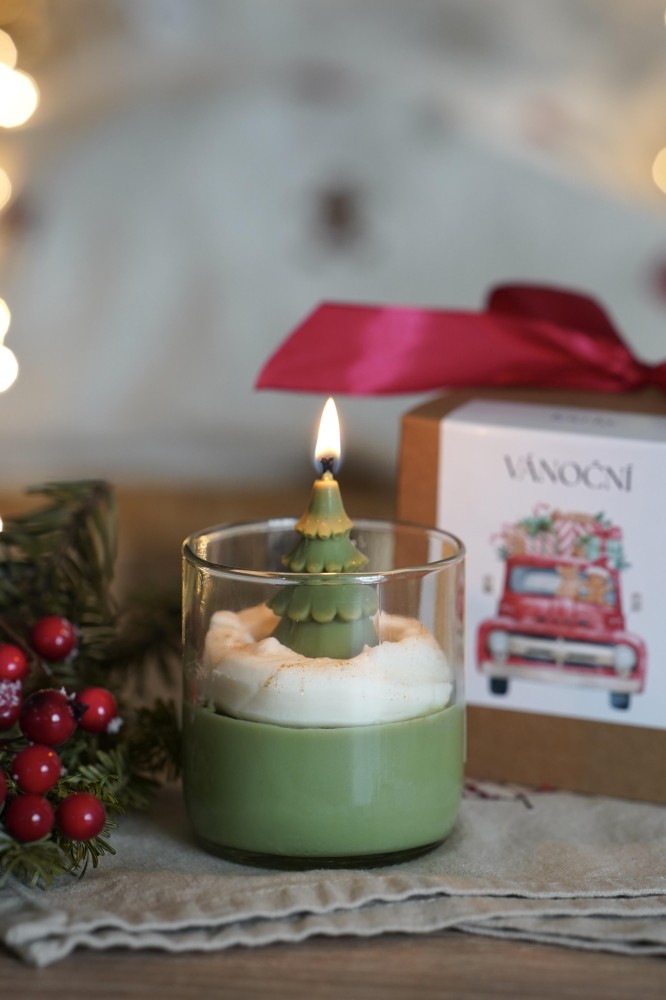 Our Christmas Candle is hand-poured from soy wax and will enchant you with its sweet vanilla fragrance touched with warm spice. The top layer is adorned with a green Christmas tree – a charming detail that brings true holiday magic into your home. As the candle burns, delicate golden sparkles gradually appear in the wax, creating a gentle festive glow. Each candle is poured into a glass jar made from a recycled wine bottle and wrapped in a gift box with a ribbon. Perfect as a thoughtful present or a beautiful addition to your holiday décor.