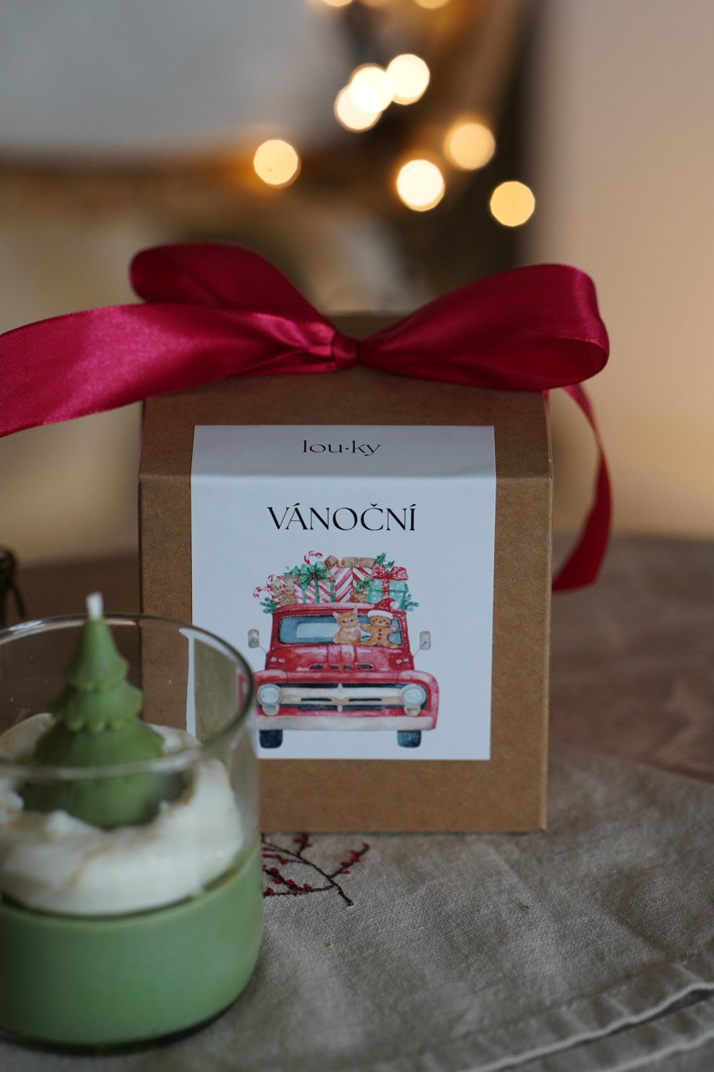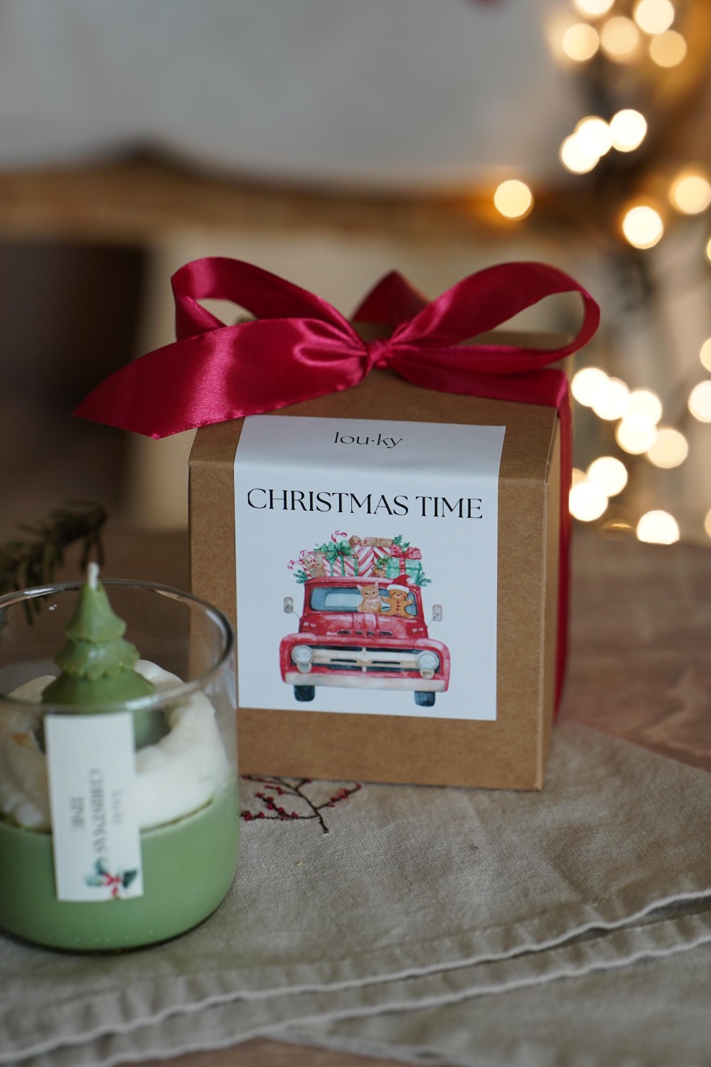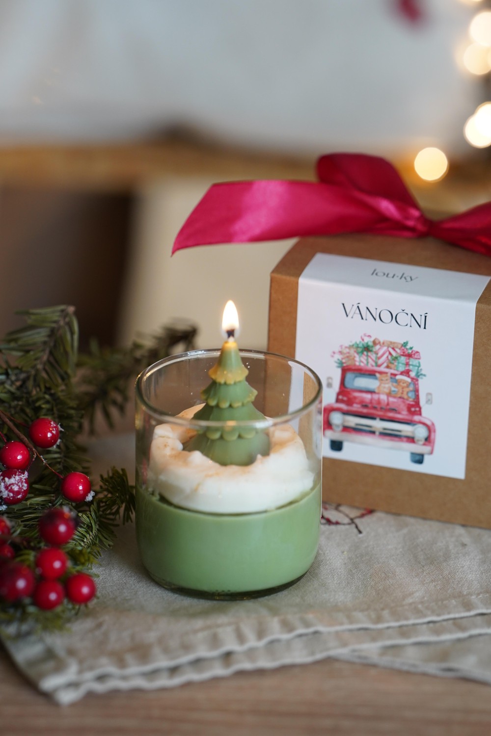 Our Christmas Candle is hand-poured from soy wax and will enchant you with its sweet vanilla fragrance touched with warm spice. The top layer is adorned with a green Christmas tree – a charming detail that brings true holiday magic into your home. As the candle burns, delicate golden sparkles gradually appear in the wax, creating a gentle festive glow. Each candle is poured into a glass jar made from a recycled wine bottle and wrapped in a gift box with a ribbon. Perfect as a thoughtful present or a beautiful addition to your holiday décor.