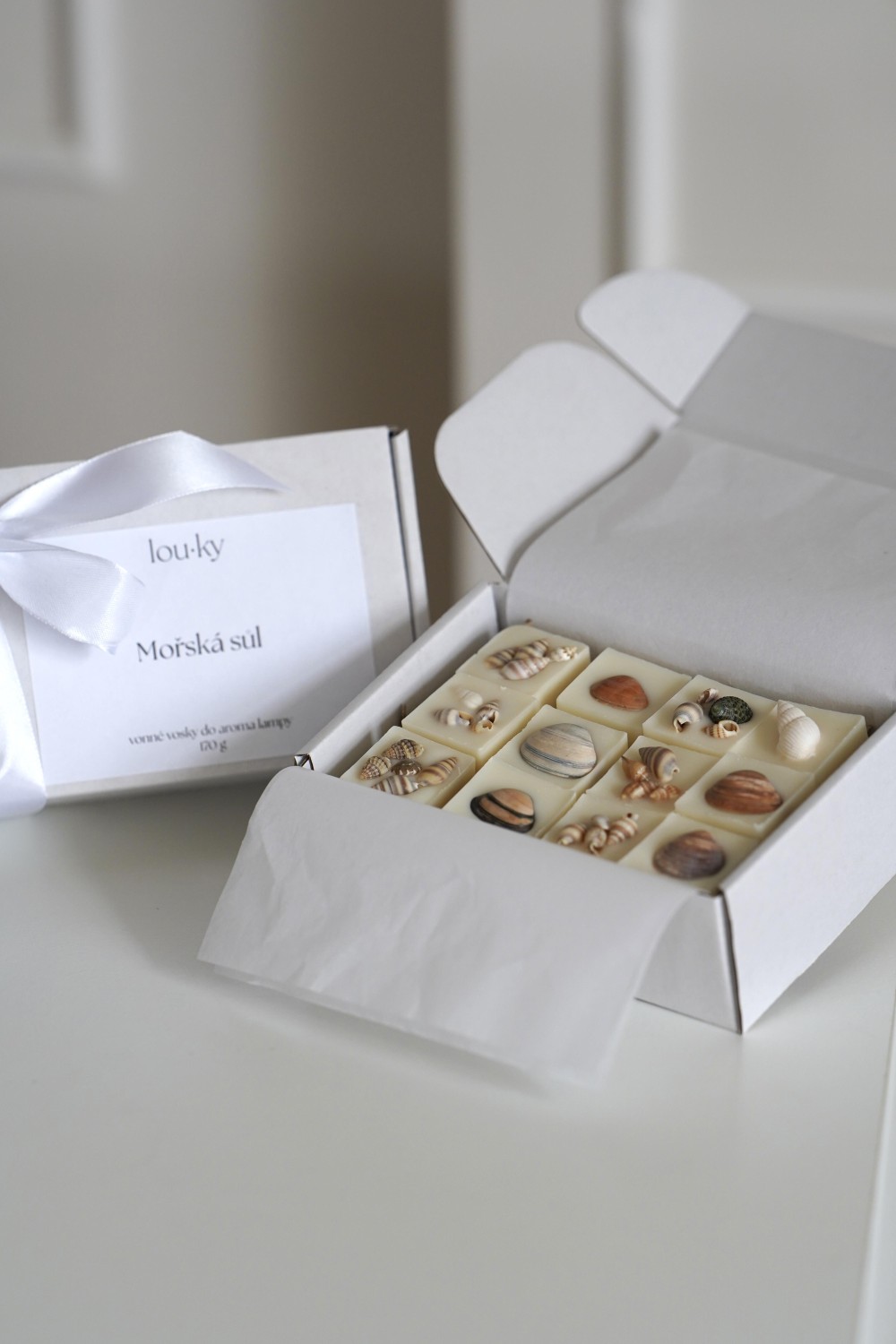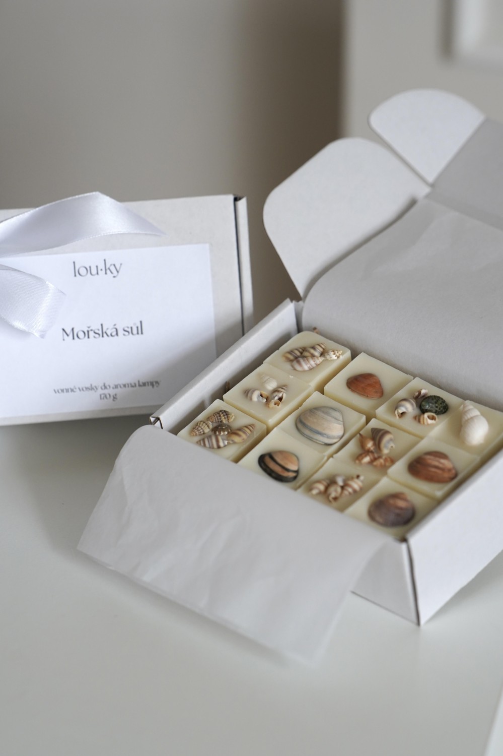 The box contains twelve wax cubes decorated with dried flowers or seashells, with a total weight of approximately 170 g (the weight may slightly vary due to handmade production). The wax melts are packed in a small gift box tied with a ribbon.